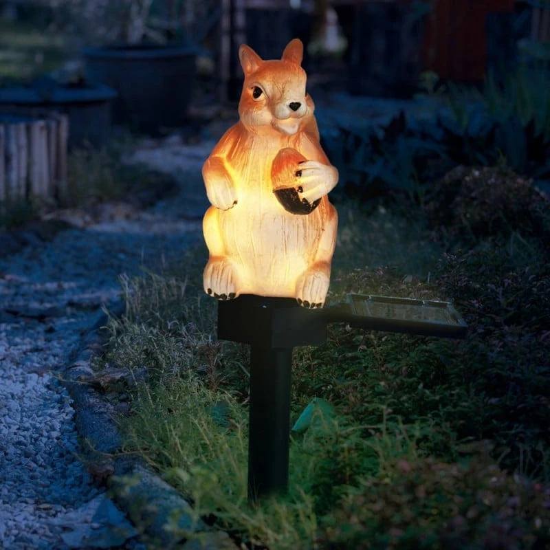 - Cette lampe de jardin en forme de petit écureuil lumineux est à poser ou à planter en jardinière, pot de fleurs, petit massif végétal ou encore allée de jardin.